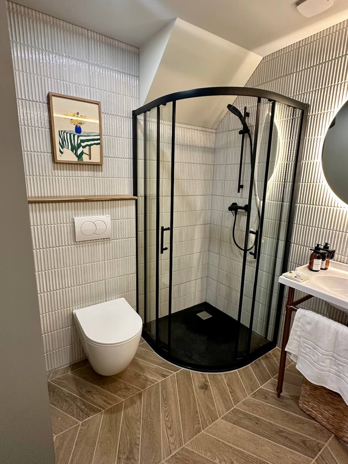 Prenez le temps de savourer une boisson chaude, confortablement installé(e) dans un fauteuil, ou plongez dans un bain relaxant après une journée au grand air. La salle de bain, équipée d’une baignoire et d’une douche, invite à un moment de détente absolue.